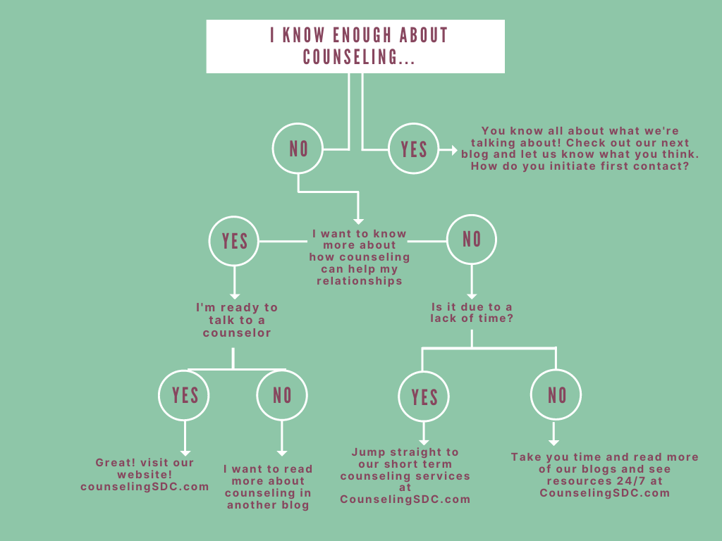 Therapists with Counseling SDC are focused on the cognitive behavioral and interpersonal aspects of your relationships (see more about our therapeutic approach here). We take a unique approach in specializing our treatments toward creating the relationship experience you deserve. This includes each counselors personal relationship with every human we provide services to. We know this begins with providing as much information as possible about the process of counseling. In this series, we will break down some basics about each aspect of counseling. Starting with initial contact, the first session, middle sessions and all the way through the last day of counseling.