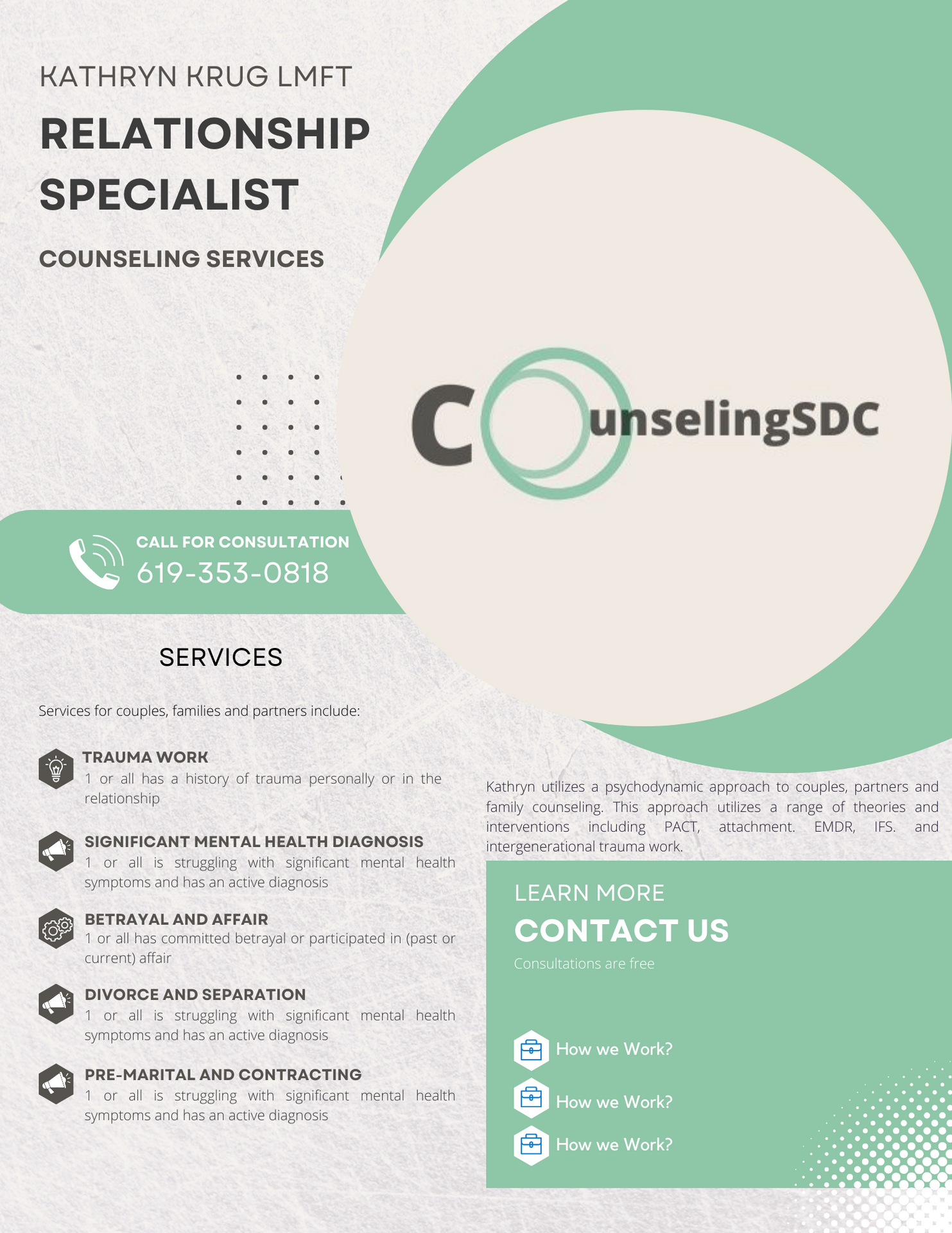 Kathryn Krug is a Licensed Marriage and Family Therapist (LMFT) in San Diego, California. She is the President-Elect of San Diego Chapter of Marriage and Family Therapists and teaches relationship and family courses as adjunct professor of Sociology at Vincennes University (San Diego).